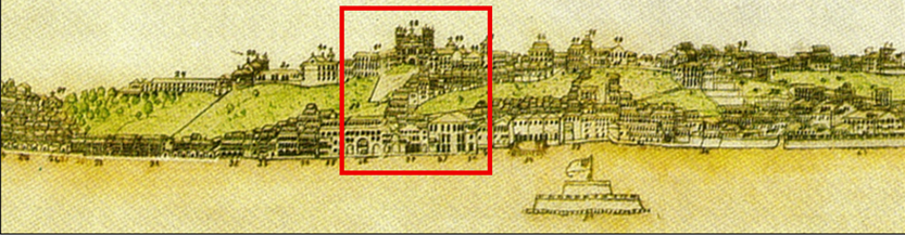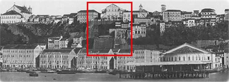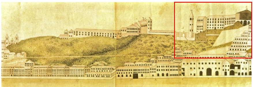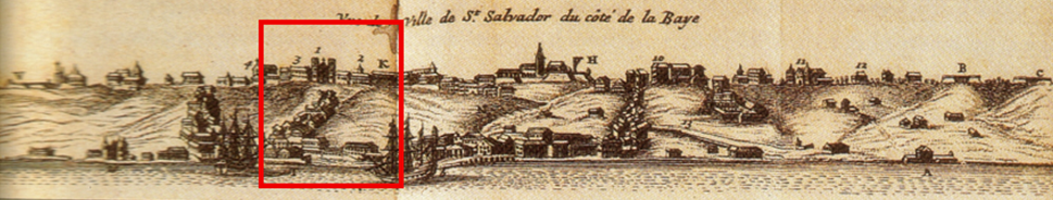 O engenheiro militar José Antônio Caldas, soteropolitano, professor da Aula Militar da Bahia, desenhou o frontispício de Salvador em 1758. No trecho que destacamos dá para perceber um deslizamento ou, então, uma contenção à frente da antiga Sé. Será que esse trecho faz parte da obra que levou mais de 20 anos para ser concluída? No mesmo desenho podemos ver, à esquerda, o Palácio Arquiepiscopal, ligado à Sé por um passadiço, a igreja de São Pedro dos Clérigos, que foi reconstruída no Terreiro de Jesus, justamente pelo risco que a encosta representava, e os prédios do conjunto dos jesuítas, ou seja, o Colégio e a capela, atual Catedral Basílica.