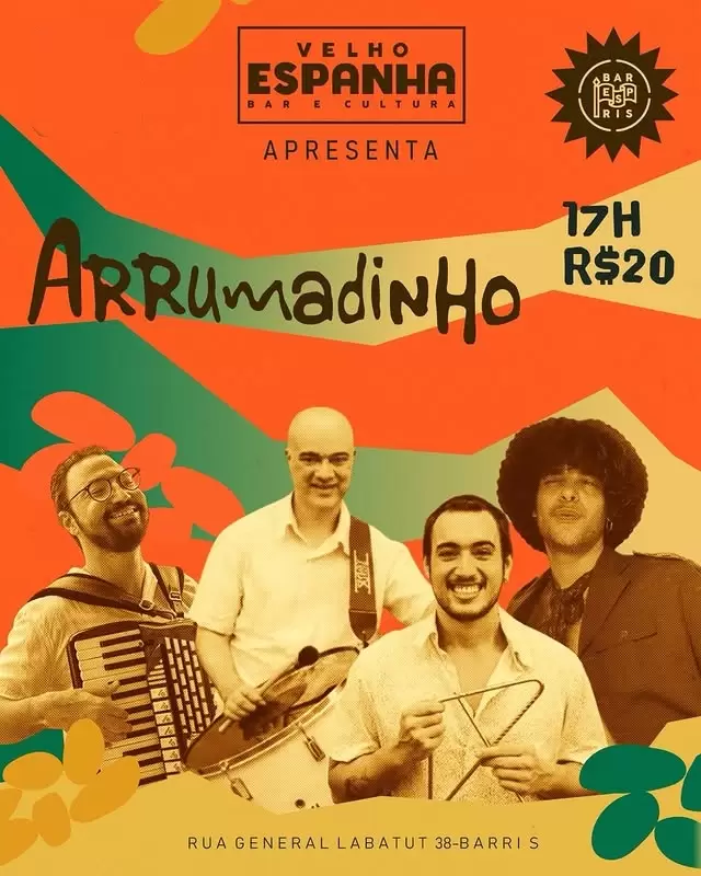 Todo domingo de março, dias 8, 15, 22 e 29, a partir das 17 horas, o Velho Espanha, no Barris, recebe o Arrumadinho, grupo formado por Tarcísio Santos, Daniel Neto, Waguinho & Di Azevedo.