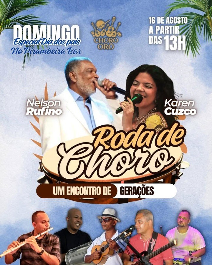 Em clima de Dia dos Pais, o grupo Choro Orô convida o mestre Nelson Rufino e a incrível Karen Cuzco para uma apresentação especial no Pirambeira Bar, no sábado, dia 16 de agosto, a partir das 13 horas.