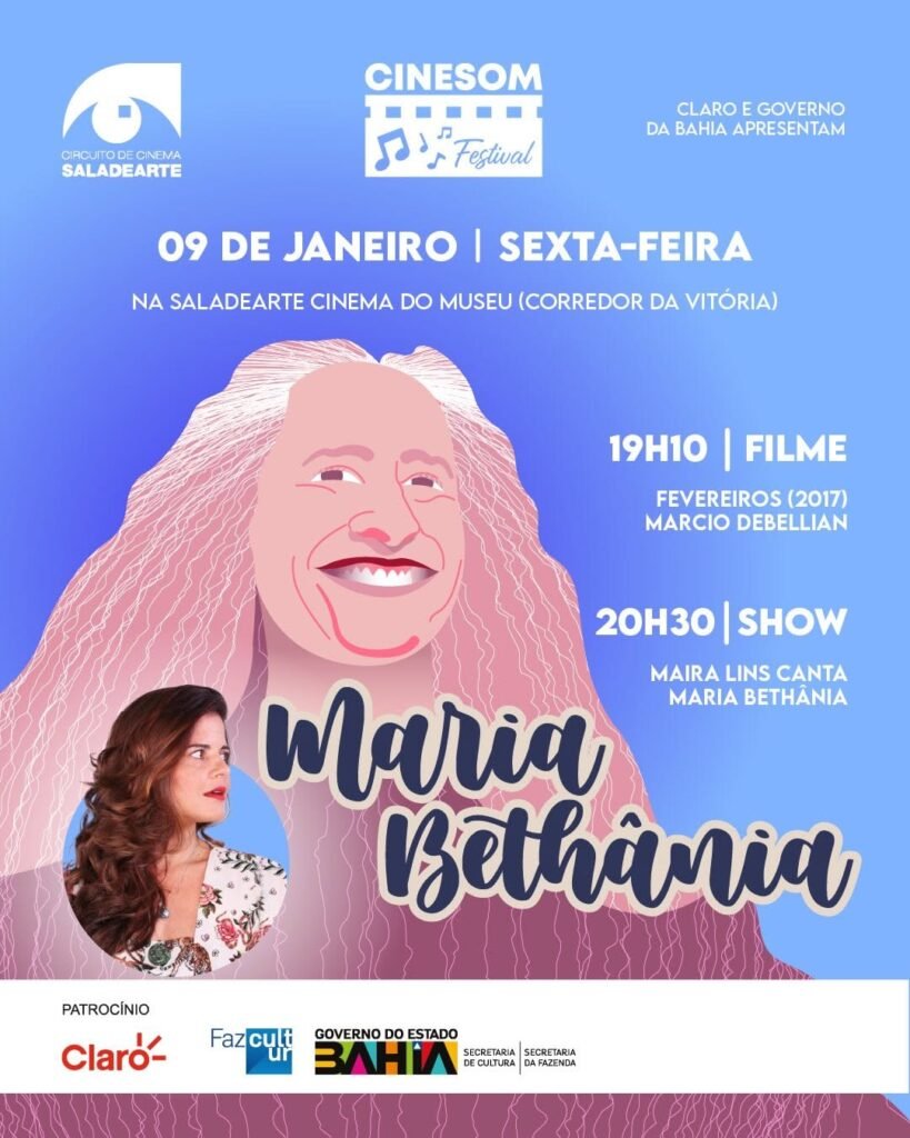 Sexta (09/01), às 19:10h, ocorre o CineSom com Maira Lins cantando Maria Bethânia no Cinema do Museu Saladearte, localizado na Av. Sete de Setembro, 2195 – Corredor da Vitória.