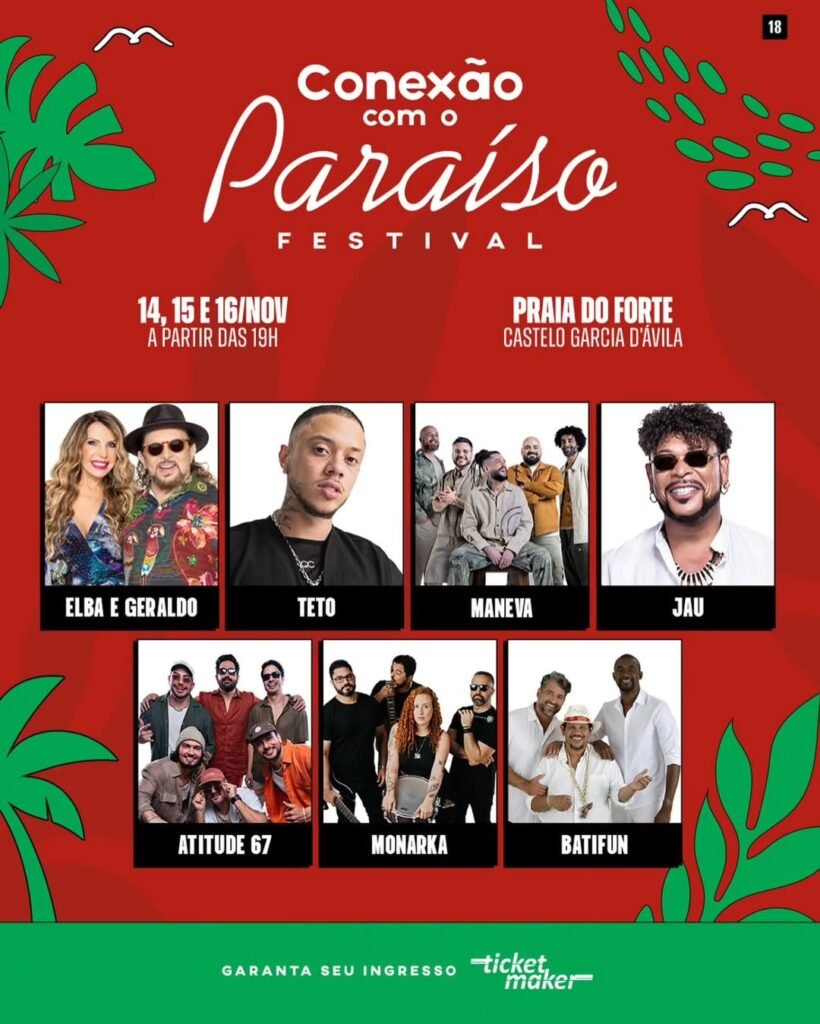 De 14 a 16 de novembro, o Castelo Garcia D’Ávila, em Praia do Forte recebe mais uma edição do Conexão com o Paraíso, recebendo show de Elba Ramalho & Geraldo Azevedo, Teto, Maneva, Jau, Atitude 67, Monarka e Batifun.
