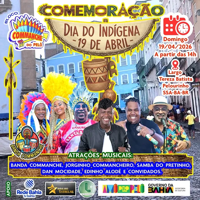No domingo (19), o bloco tradicional Commanche do Pelô se apresenta no Largo Tereza Batista, no Pelourinho, a partir das 14h, em homenagem ao Dia dos Povos Indígenas. O evento recebe ainda Samba do Pretinho, Dan Mocidade, Jorginho Commancheiro, Edinho Alodê e outros convidados.
