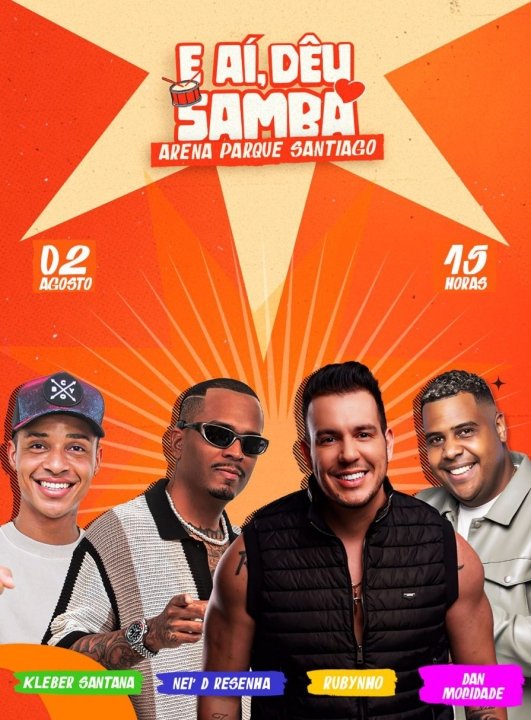 No palco, quatro grandes nomes do pagode garantem o clima de resenha e diversão: Rubynho, Dan Moridade, Nei D Resenha e Kleber Santana. Juntos, eles prometem transformar a Arena em um verdadeiro reduto de alegria, com sucessos que vão do romântico ao dançante — tudo com aquele tempero baiano que só Salvador tem.