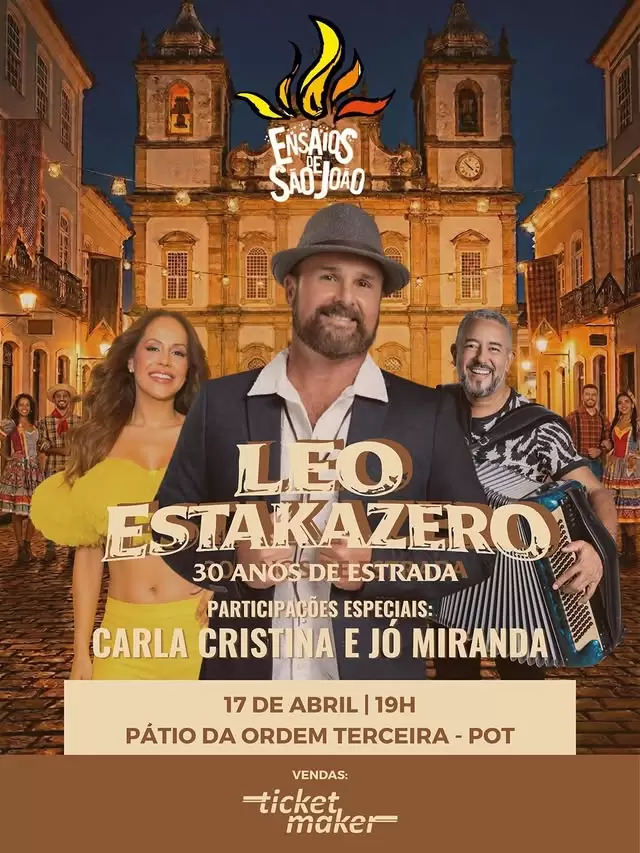 Leo Estakazero estreia no dia 17 de abril, às 19h, o Projeto “Ensaios de São João”, que este ano tem o tema 30 Anos de Estrada, no Pátio da Ordem Terceira de São Francisco, Pelourinho. A apresentação marca as comemorações das três décadas de carreira do artista e contará com as participações dos amigos Carla Cristina e Jó Miranda.