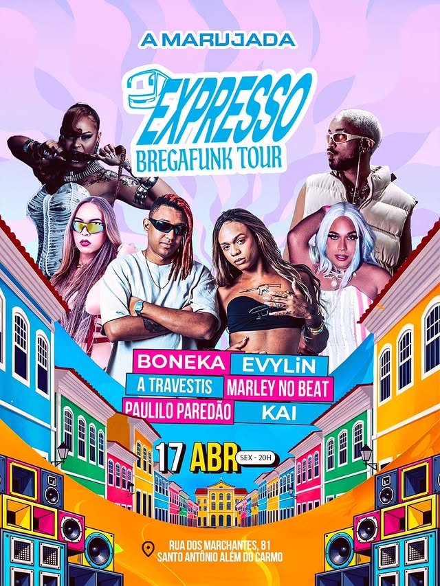O Expresso Bregafunk Tour é uma turnê nordestina da DJ Boneka e do DJ Marley no Beat, dois ícones da cena bregafunk pernambucana. Eles desembarcam em Salvador, no próximo dia 17 de abril, sexta-feira, na Marujada, no Santo Antônio. A programação conta com Kai (PE), Boneka (PE) convida Evylin, Marley no Beat (PE) convida A Travestis (BA) e Paulilo Paredão (BA).