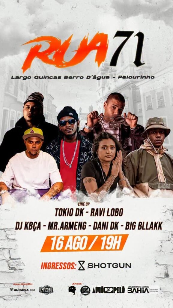 O Rua71 chega a sua terceira edição, ampliando seus horizontes e se tornando um Festival de Música Rap Underground. O evento vai promover mais uma vez o encontro de artistas soteropolitanos com artistas de outros estados. Na Line nomes como Dj Kbça, Mr. Armeng, Ravi Lobo, Dani DK (SE), Big Bllakk (RJ), TokioDK (RJ). Idealizado pela produtora Audácia Black, juntamente com a Ugangue, o evento promete mais uma vez atender as expectativas do público, como foi na edição anterior. O evento ocorre no Largo Quincas Berro D’Agua no Pelourinho, no dia 16 de Agosto de 2025, com início pontualmente às 19 Horas.
