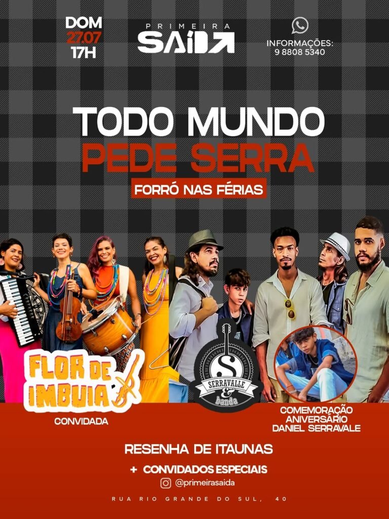 Neste domingo, 27 de julho, tem Forró no Primeira Saída, na Pituba, com Forró Serravalle & Banda e recebe a turma da Flor de Imbuia como convidadas, a partir das 17 horas.