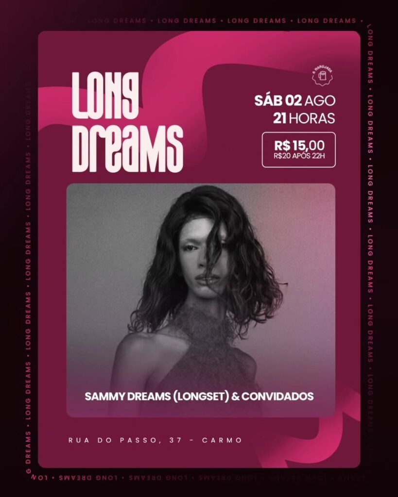 Sábado (02/08), às 21h, ocorre a festa Long Dreams com DJ set extendido de Sammy Dreams e convidados no A Marujada, localizada na Rua do Passo, 37 – Santo Antônio Além do Carmo.