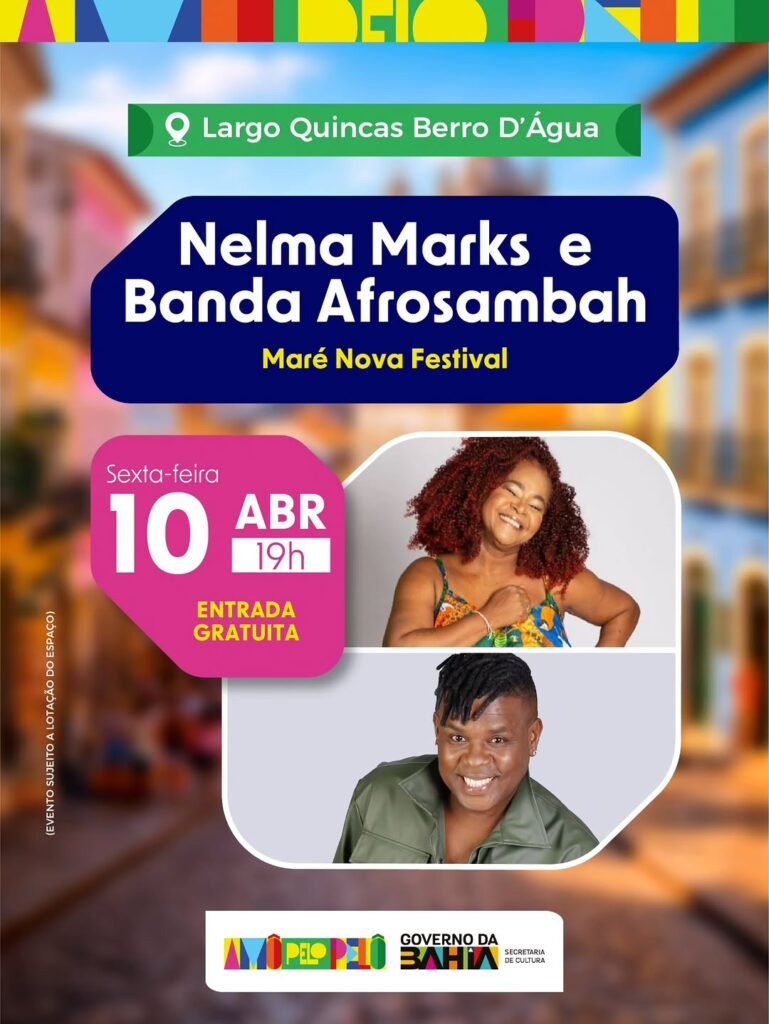 Na sexta-feira (10), o Largo Quincas Berro D’Água, no Pelourinho, recebe o Maré Nova Festival, com shows de Nelma Marks e Banda Afrosambah, a partir das 19h. A entrada é gratuita.