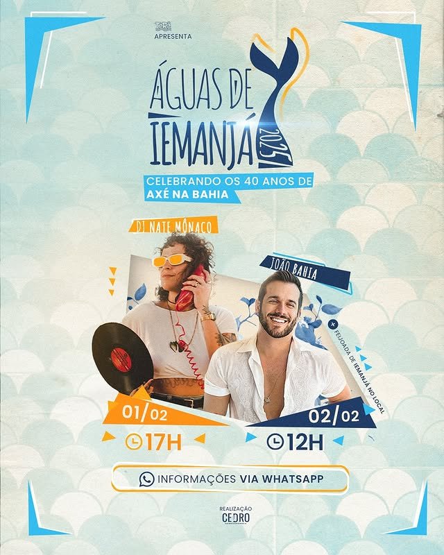 No domingo (02/02) celebramos os 40 anos do Axé na Bahia, com show de João Bahia, além da tradicional Feijoda de Iemanjá.