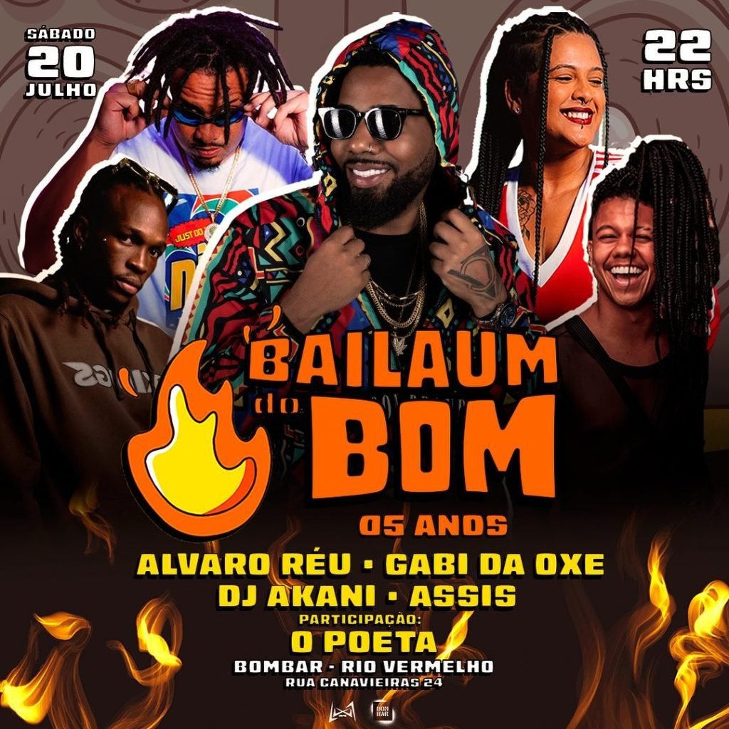Sábado (20/07), às 22h, ocorre o Bailaum do Bom, festa que contará com shows de Alvaro Réu, Gabi da Oxe, DJ Akani, Assis e participação de O Poeta. O evento acontecerá no Bombar, localizado na Rua canavieiras, 24, Rio Vermelho.