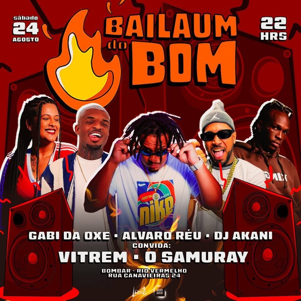 Sábado (24/08), às 22h, ocorre o Bailaum do Bom, com apresentação da Gabi da Oxe, Alvaro Réu, DJ Akani e Vitrem – O Samuray. A festa ocorre no Bombar, localizado na Rua canavieiras, 24, Rio Vermelho.