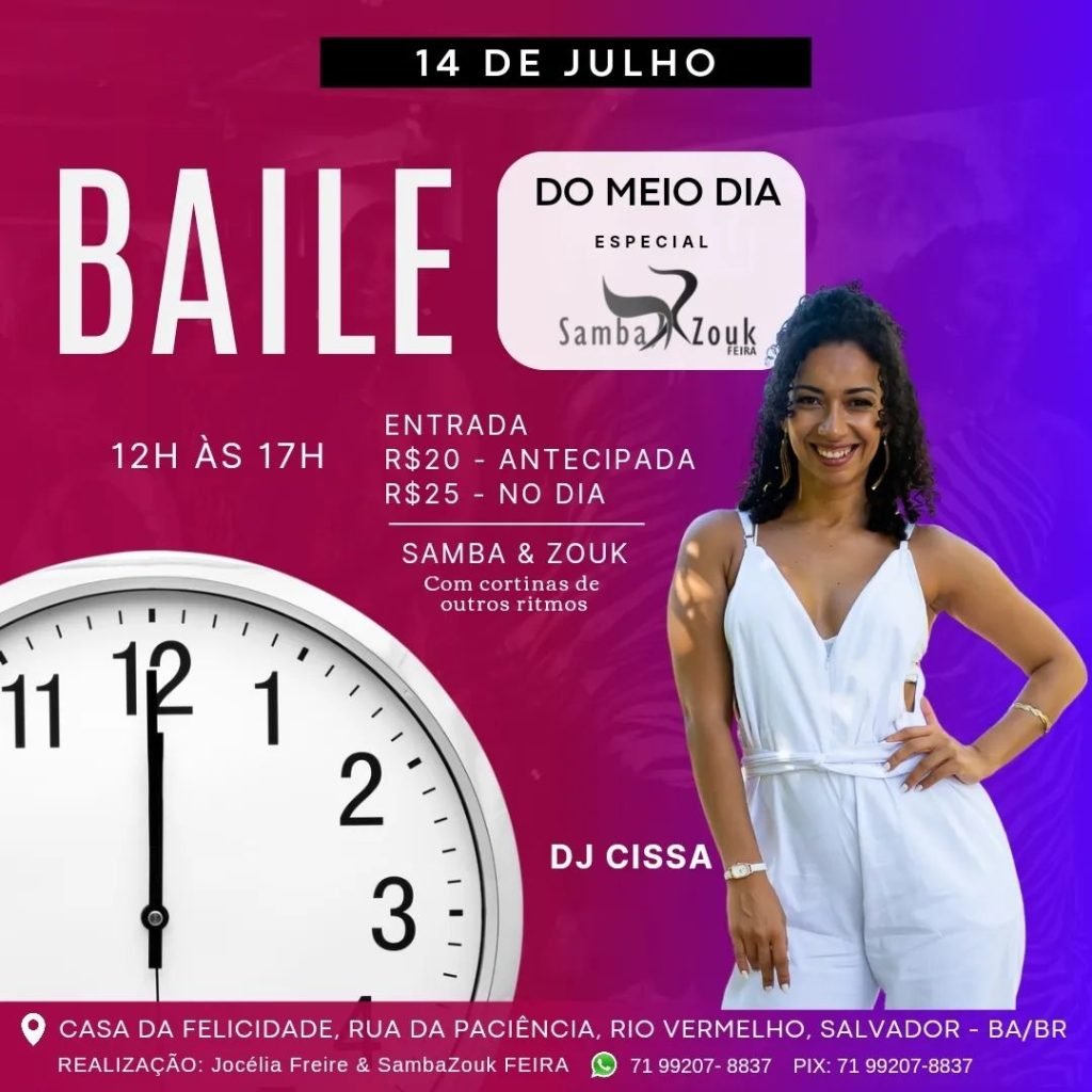 Neste domingo (14/07), de 12h às 17h, acontece o Baile do Meio dia especial Samba & Zouk com os DJs Cissa, Keu e Dudu , na Casa da Felicidade, localizada na Rua da Paciência, Rio Vermelho.