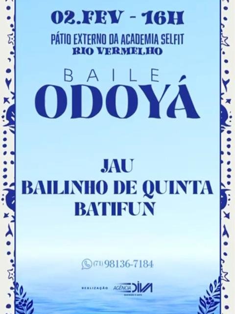 No dia 2 de fevereiro, acontece o Baile Odoyá, no pátio externo da Academia Selfit Rio Vermelho, ali perto do Largo da Mariquita, com shows de Jau, Bailinho de Quinta, Batifun e DJ Lucio K, a partir das 16 horas
