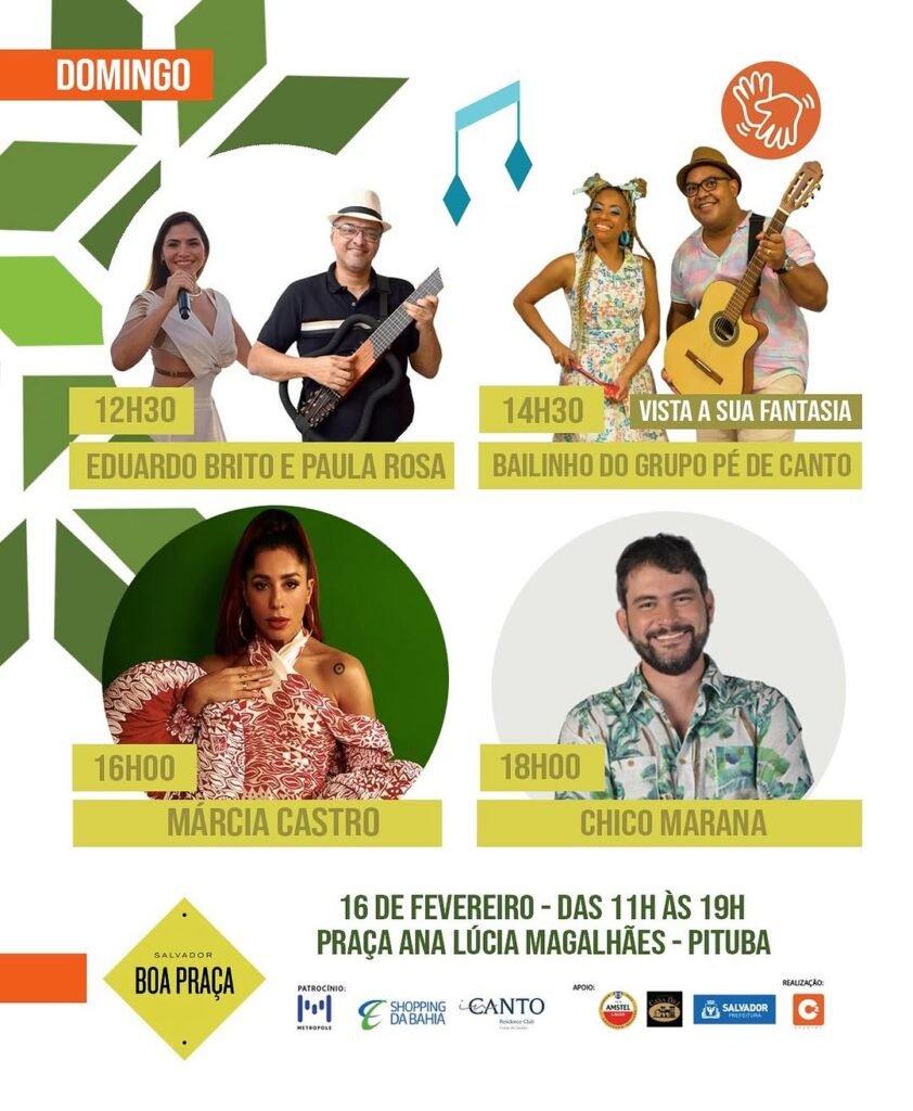 Domingo (16/02), às 11h, ocorre o Boa Praça com apresentação de Márcia Castro, Chica Marana, Eduardo Brito e Paula Rosa e Bailinho do Grupo Pé de Canto na Praça Ana Lúcia Magalhães, localizada na Pituba.