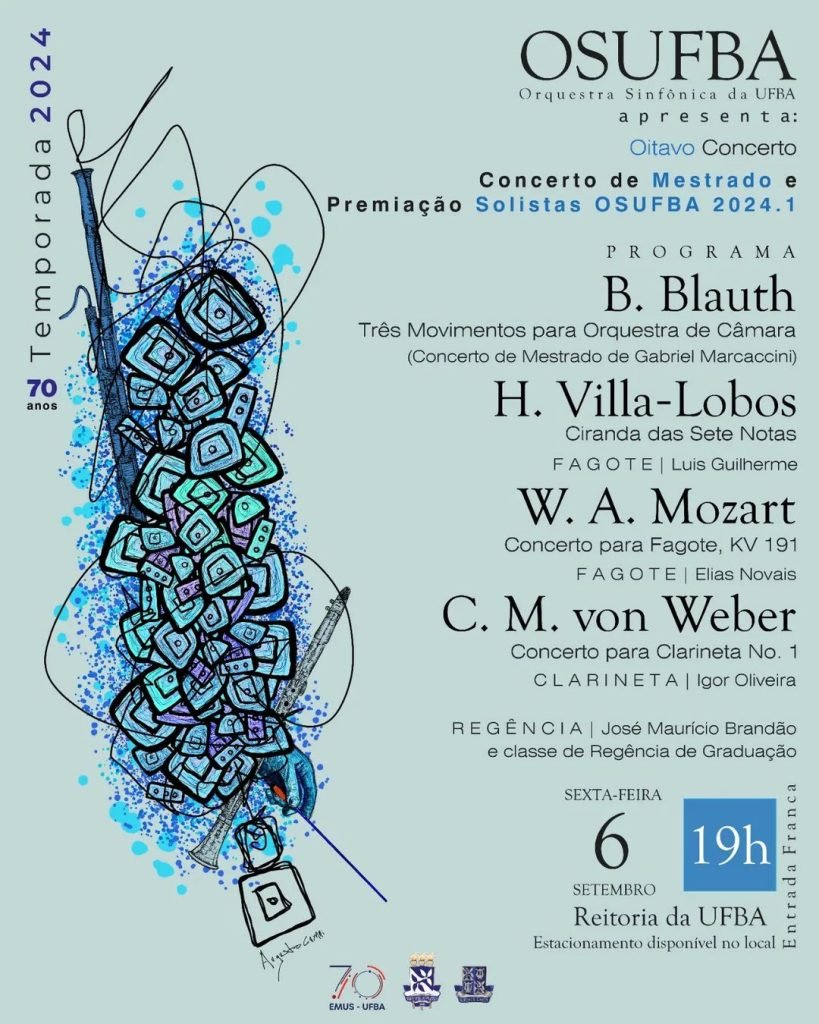 Sexta (06/09), às 19h, ocorre o oitavo Concerto da temporada 2024 da Orquestra Sinfônica da UFBA. Esta edição é também um Concerto de Mestrado e a Premiação do Concurso Solistas OSUFBA 2024.1. No Programa, serão apresentadas obras de Blauth, Villa-Lobos, Mozart e Weber.