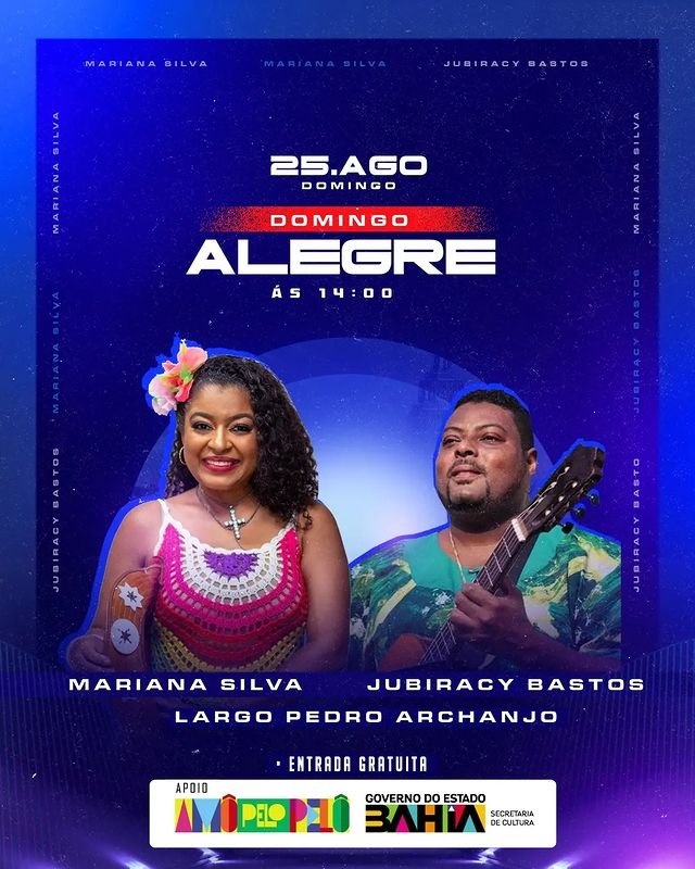 O Largo Pedro Archanjo recebe neste domingo, dia 25 de agosto, os shows de Jubiraci Bastos e Mariana Silva no Projeto Domingo Alegre, a partir das 14 horas.