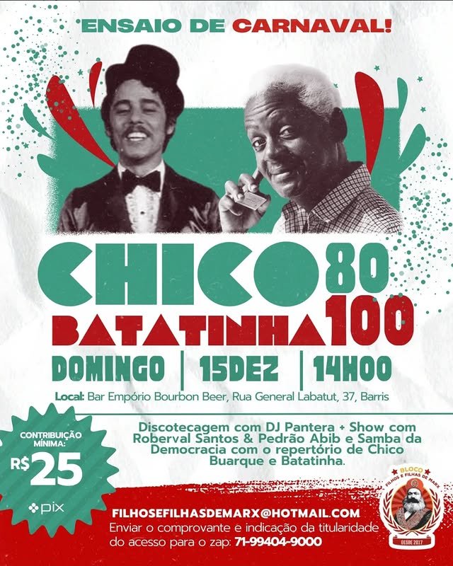 No domingo, 15, acontece o Ensaio de Carnaval do Bloco Filhos e Filhas de Marx com Discotecagem de DJ Pantera + Show com Roberval Santos & Pedrão Abib e Samba da Democracia com o repertório de Chico Buarque e Batatinha.