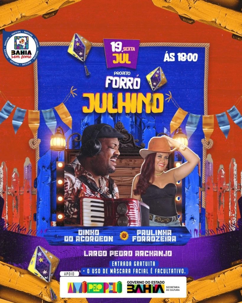 Sexta (19/07), às 19h, ocorre o Forró Julhino, com shows de Dinho do Acordeon e Paulinha Forrozeira. O evento acontecerá no Largo Pedro Archanjo, localizado na Rua Gregório de Matos, 10 – Pelourinho e é gratuito.