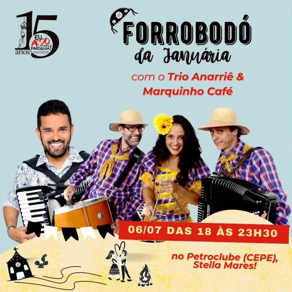 No dia 06/07 (sábado), das 18h às 23:30h, acontece o Forrobodó da Januária, com participação do Trio Anarriê e de Marquinho Café. O evento acontecerá no Petroclube (CEPE), Stella Mares.