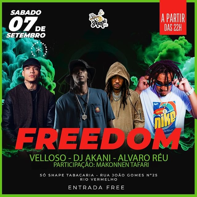 Neste sábado, 7 de setembro, a partir das 22h, a Só Shape Tabacaria vai ser palco de uma noite Freedom com DJ sets de Velloso, Alvaro Réu e DJ Akani, além da participação especial de Makonnen Tafari.