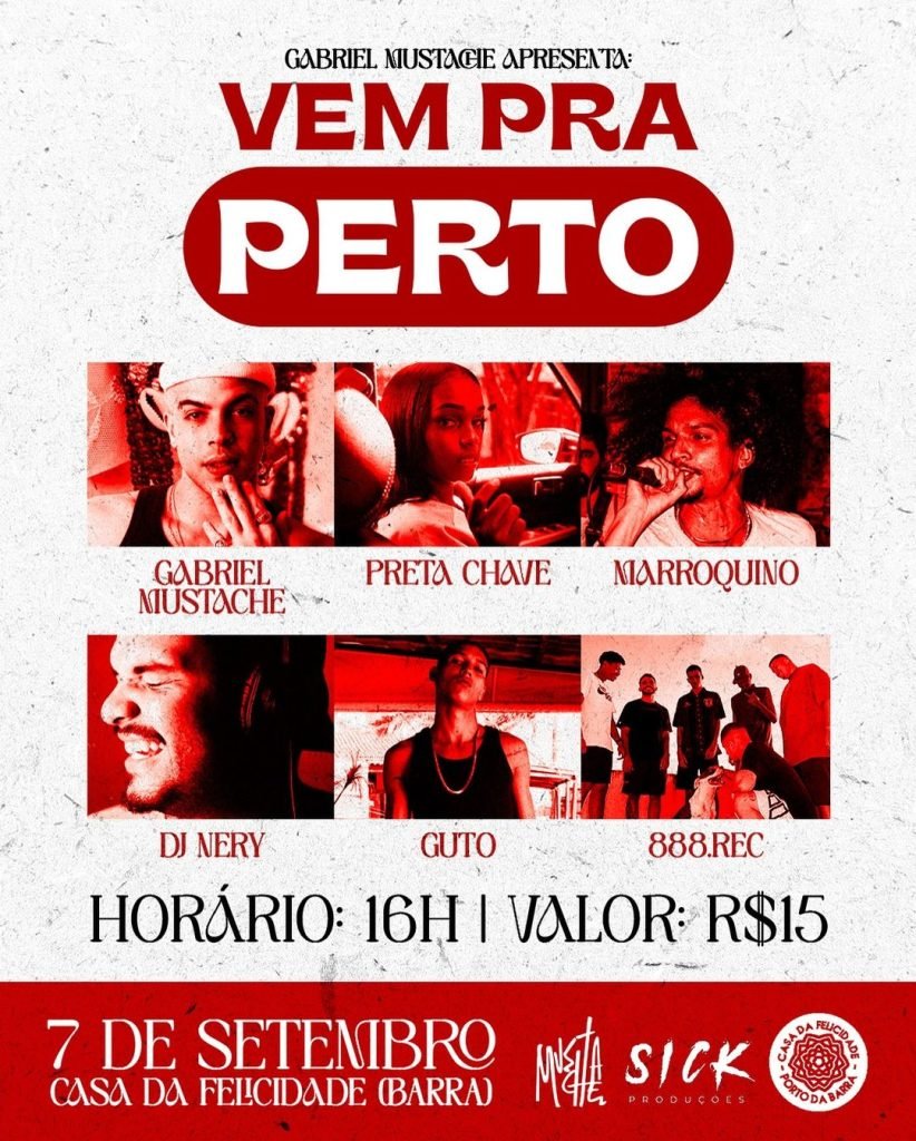 Sábado (07/09), às 16h, Gabriel Mustache apresenta Vem pra Perto com apresentação de Preta Chave, Marroquino, DJ Nery, Guto e 888.Rec na Casa da Felicidade, localizada na Av. Sete de Setembro, 3713 – Barra.