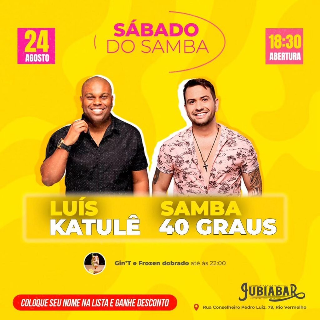 Sábado (21/08), às 18:30h, Luis Katulê e Samba 40 graus se apresentam no Jubiabar, localizado na Rua Conselheiro Pedro Luiz, 79, Rio Vermelho.