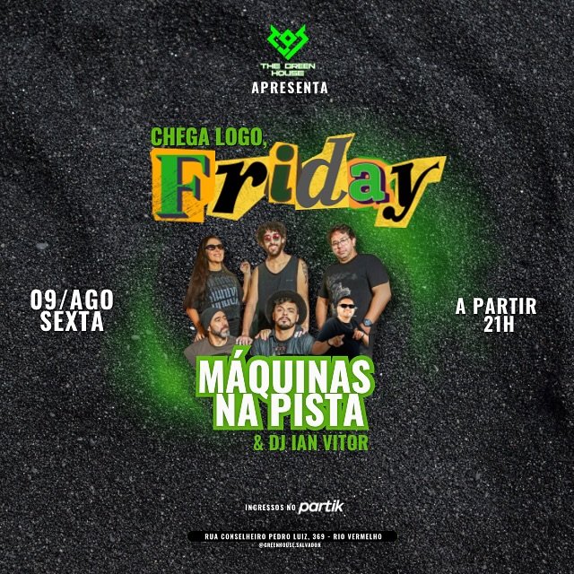 No sábado (24/08), às 21h, Máquinas na Pista se apresenta na The Green House, localizada na Rua Conselheiro Pedro Luiz, 369, Rio Vermelho.