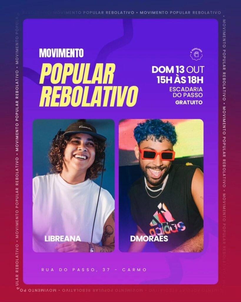 Neste domingo, dia 13, a Escadaria do Passo vai virar pista com o Movimento Popular Rebolativo, com os DJs Libre Ana e Dmoraes no comando. A festa é gratuita e começa às 15 horas.