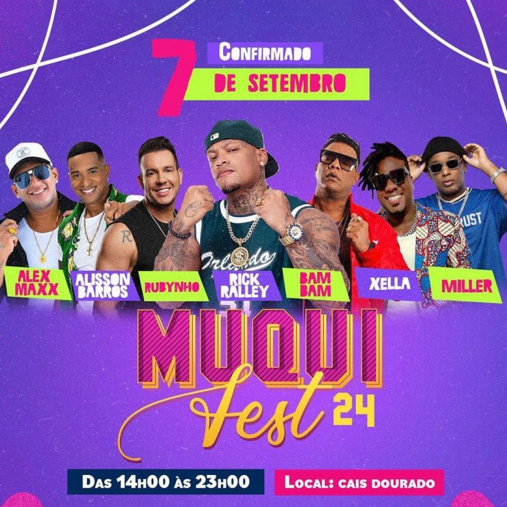No dia 7 de setembro, acontece o Muquifest 2024, que recebe Rick Ralley, Rubynho, Bam Bam, Alisson Barros, Xella, Ale Maxx e Miller no Cais Dourado, Comércio, a partir das 14 horas.