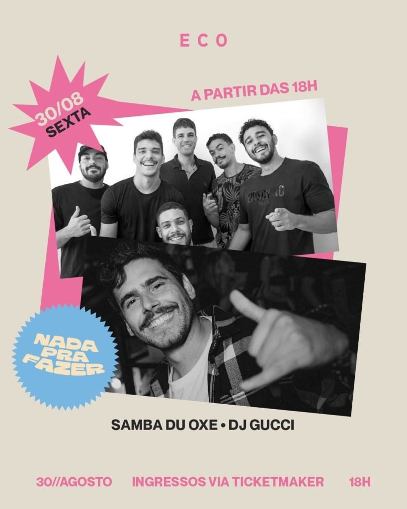 Sexta (30/08), às 18h, ocorre o Nada pra Fazer, com apresentação de Samba du Oxe e DJ Gucci. O evento acontecerá no ECO, localizado na Rua Conselheiro Pedro Luiz, 348, Rio Vermelho.