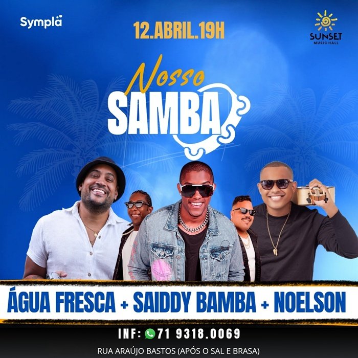 No dia 12 de abril, acontece o Nosso Samba no Sunset Music Bar com Água Fresca, Saiddy Bamba e Noelson.