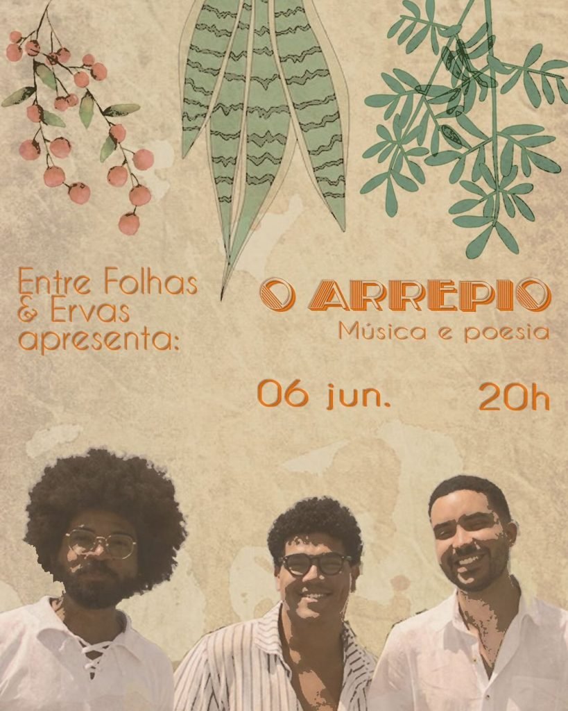 Neste domingo, dia 14 às 17 horas, o Jardim Entre Folhas e Ervas recebe o grupo O Arrepio, com muita música, poesia e alegria. O Arrepio traz Adrião Filho Arrepio Poético (Perfomance Poética), João Sereno (Vocal e Violão) e Osvaldo Bola (Vocal, Violão e Cavaquinho).