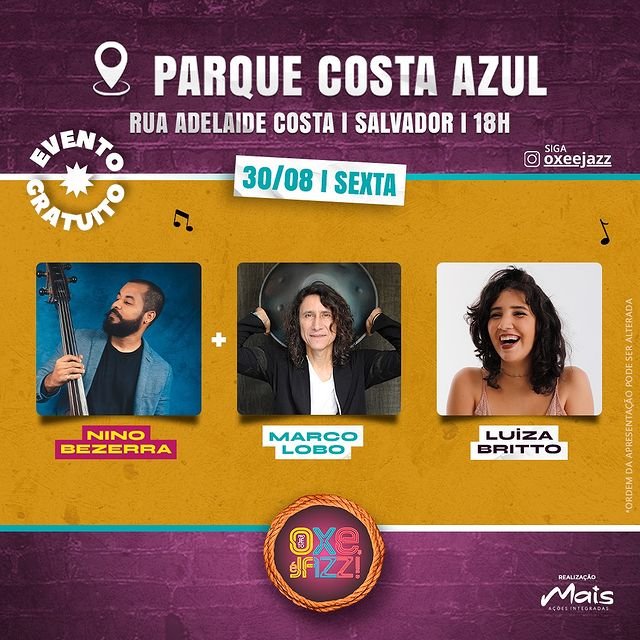Neste fim de semana, sexta e sábado, dias 30 e 31, tem uma uma edição do projeto ‘Oxe, é Jazz’, reunindo artistas em dois dias de shows no Parque Costa Azul. A entrada é gratuita.