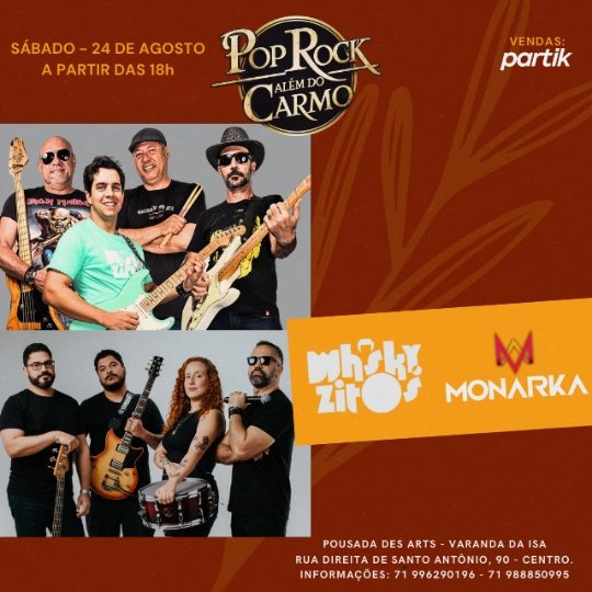 Neste sábado, dia 24/08, acontece o Pop Rock Além do Carmo com as bandas Whiskzitos e Monarka,a partir das 18 horas, no R. Direita de Santo Antônio, 90 em Salvador/BA.
