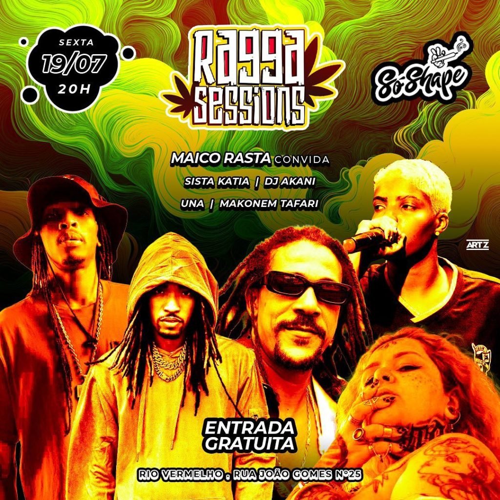 Sexta (19/07), às 20h, ocorre o Ragga Sessions. A convite da Só Shape Tabacaria, acontece mais uma edição do projeto encabeçado por Maico Rasta, que dessa vez encontra com Sista Katia, DJ Akani, Una e Makonem Tafari.