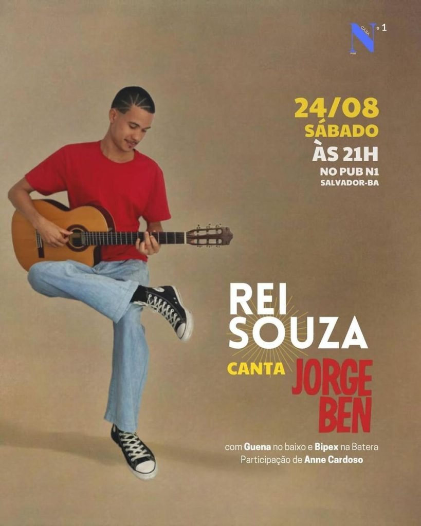 Sábado (24/08), às 21h, Rei Souza canta Jorge Ben no Pub Casa N°1, localizado na Rua Aristides Áttico, 38 – Barbalho. Ele estará acompanhado de Guena no baixo e Bipex na bateira, além da participação de Anne Cardoso.
