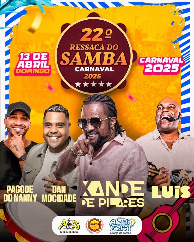 Neste domingo, 13 de abril, o Cais Dourado em Salvador/BA se transformará no epicentro da folia com a 22ª RESSACA DO SAMBA – CARNAVAL 2025 – o maior evento de samba da cidade. Promovido pela A.S Produções e pelo tradicional Bloco Alerta Geral, a festa é uma verdadeira celebração do ritmo, da alegria e da energia contagiante que só o samba e o pagode oferecem.