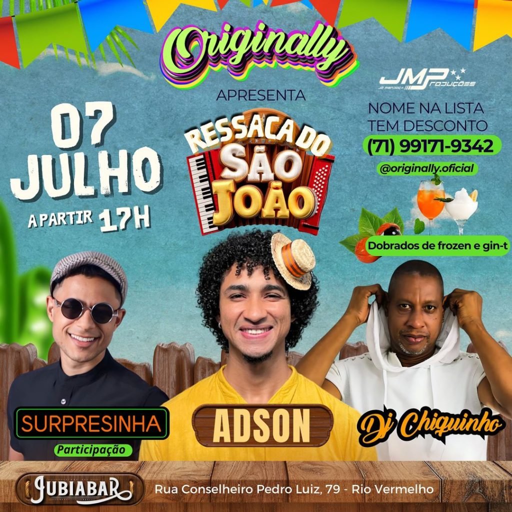 Domingo (07/07), às 17h, ocorre o Ressaca do São João com Adson, DJ Chiquinho e Banda Surpresinha. O evento ocorre no Jubiabar, localizado na Rua Conselheiro Pedro Luiz, 79, Rio Vermelho.