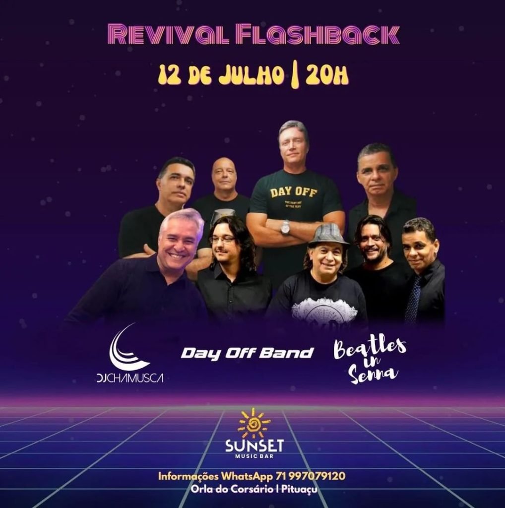 Sexta (12/07), às 20h, ocorre o Revival Flashback com Dj Chamusca, Beatles in Senna e Banda Day Off. O evento acontecerá no Sunset Music Bar, localizado na Rua Araújo Bastos, 3 – Pituaçu.