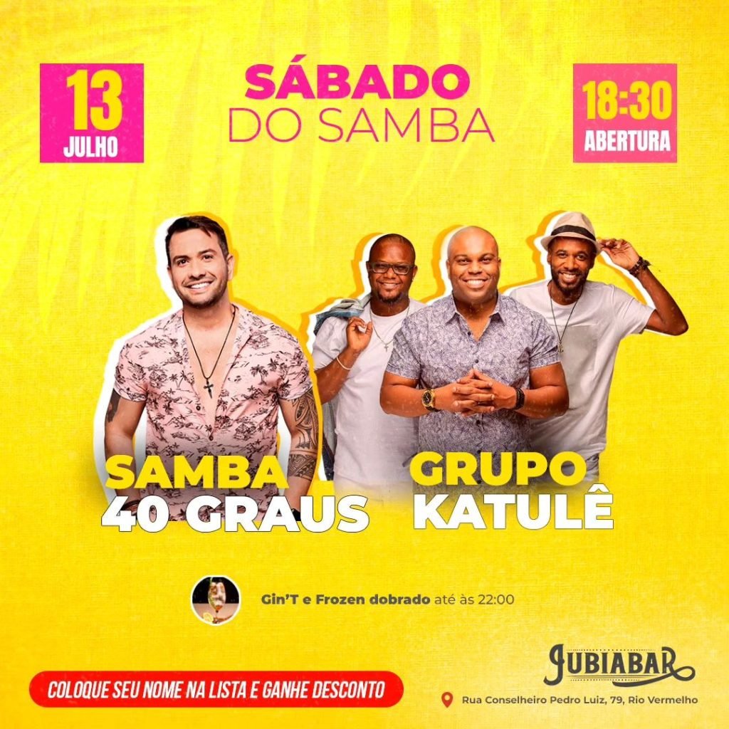 Neste sábado (13/07) ocorre o Sábado do Samba com comGrupo Katulê e Samba 40 graus. O evento acontecerá às 18:30 no Jubiabar, localizado na Rua Conselheiro Pedro Luiz, 79, Rio Vermelho.