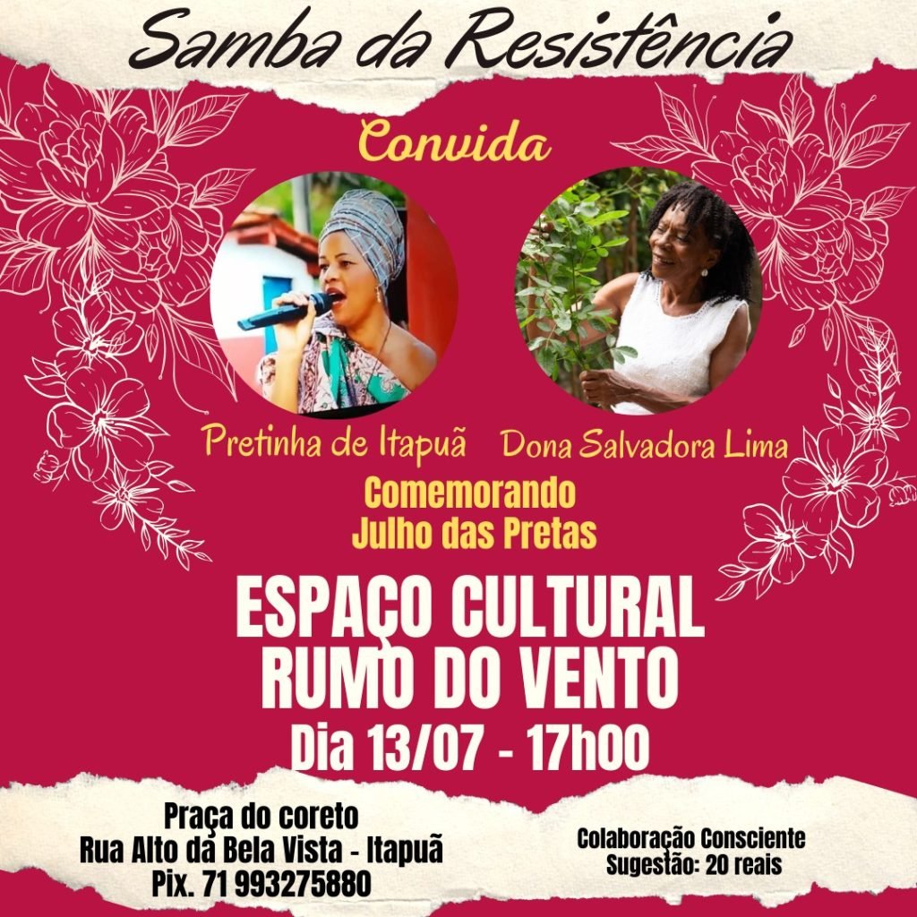Estamos no JULHO DAS PRETAS e para comemorar, o SAMBA DA RESISTÊNCIA convida duas mulheres pretas talentosíssimas de nossa comunidade: Pretinha de Itapuã e Dona Salvadora Lima no próximo sábado dia 13/07 a partir das 17hs no Espaço Cultural Rumo do Vento em Itapuã . Venha e traga os amigos e a família para curtir um samba de qualidade , acompanhado daquela cervejinha gelada e petiscos especiais. É gratuito, mas pedimos a colaboração consciente pelo Pix (71)99327-5880 Pedro R J Abib. Sugestão: 20 reais (pode ser mais, menos, ou quanto puder!)