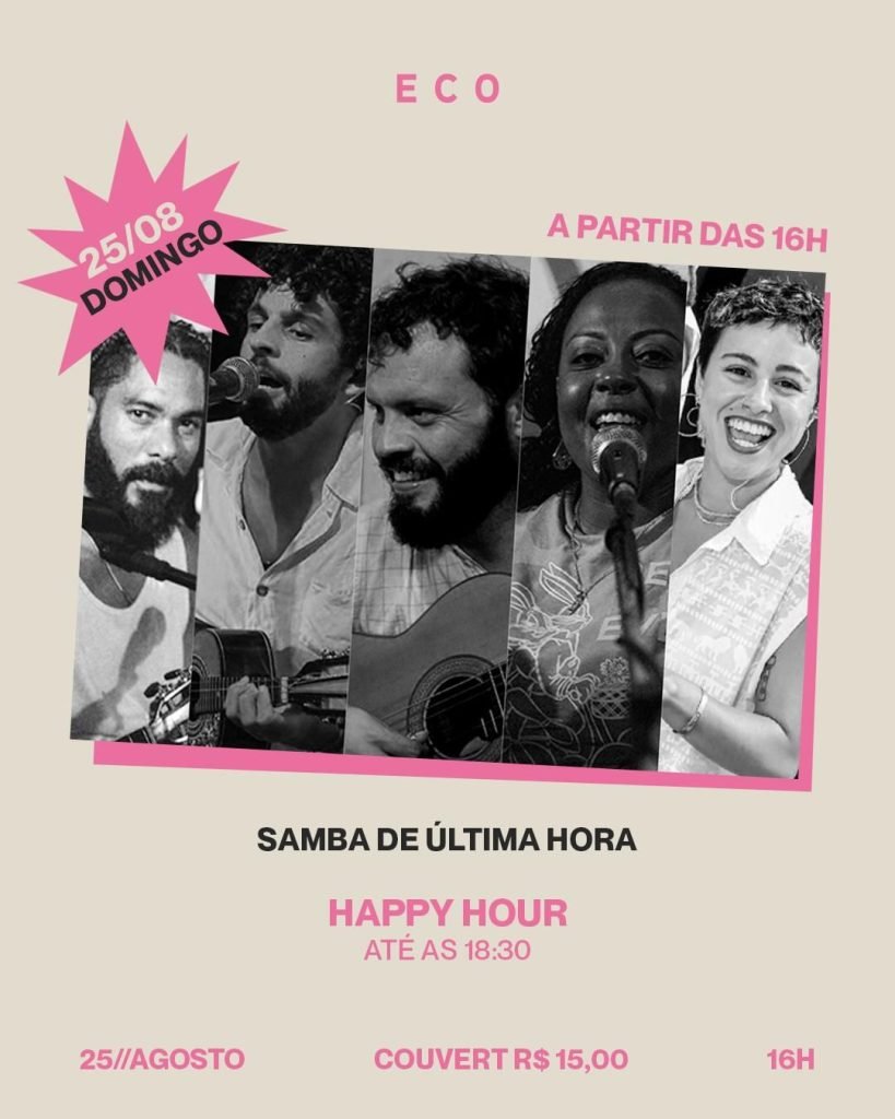 Domingo (25/08), às 16h, Samba de Última Hora se apresenta na ECO, localizado na Rua Conselheiro Pedro Luiz, 348, Rio Vermelho.