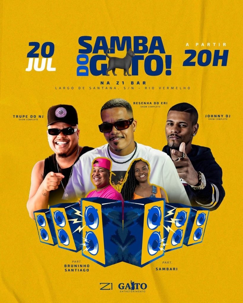 Sábado (20/07), às 20h, ocorre o Samba do Gato com Trupe do Nj, Resenha do Eri e Johnny DJ. O evento acontecerá no Z1 Bar, localizado no Largo de Santana – Rio Vermelho.