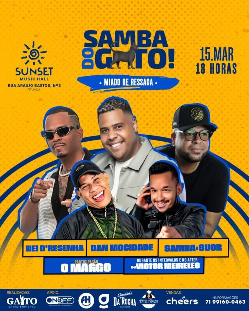 Sábado (15/03), às 18h, ocorre o Samba do Gato com apresentação de Nei D’Resenha, Dan Mocidade, Samba e Suor, O Maggo e DJ Vitor Meireles no Sunset Music Bar, localizado na Rua Araújo Bastos, 3 – Pituaçu.