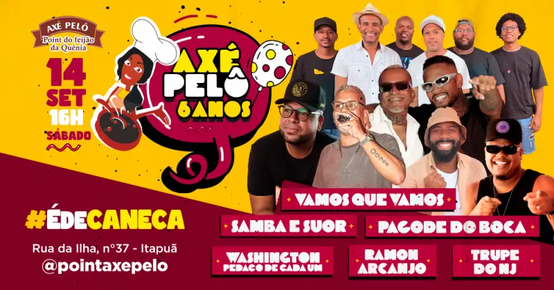 No dia 14 de setembro, a partir das 16 horas, tem aniversário do Espaço Axé Pelo Point da Quênia com shows das bandas Samba e Suor, Vamos que Vamos, Pagode do Boca, Washington Padaço, De Cada Um, Ramon Arcanjo, Trupe do NJ e Djs.