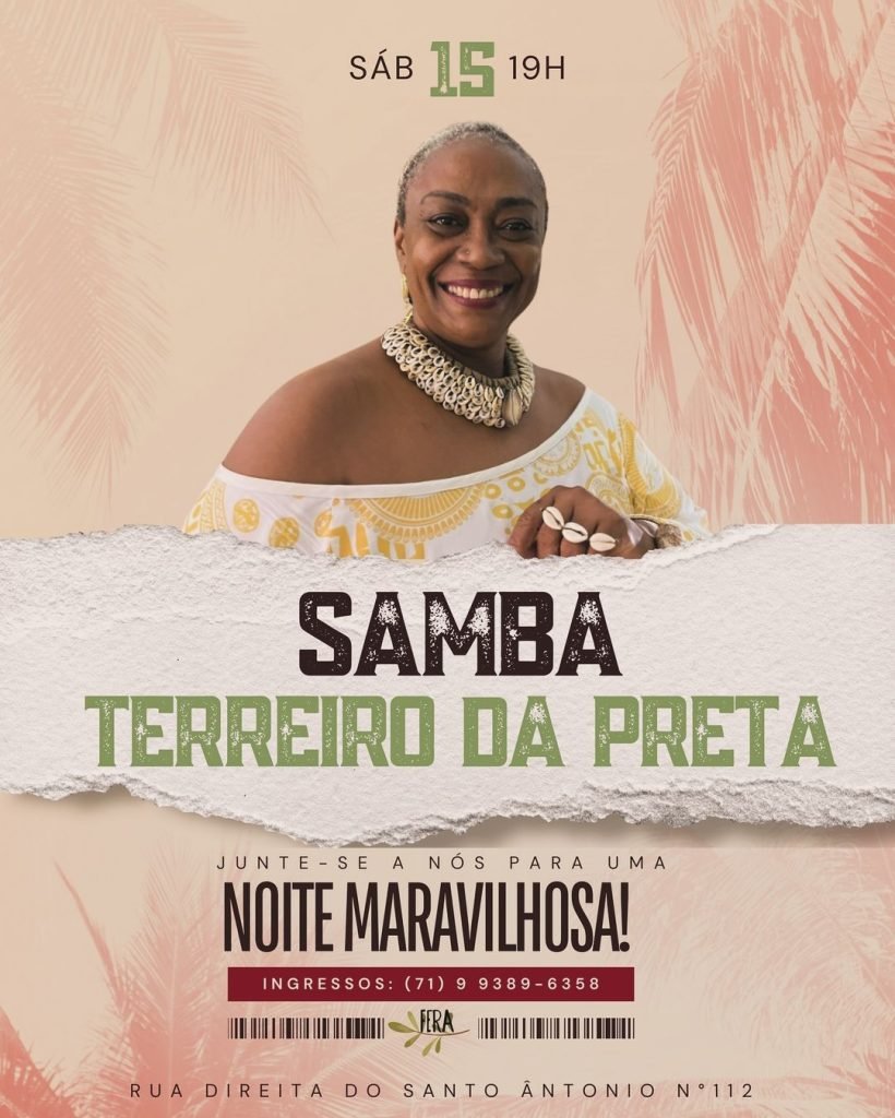 Sábado (15/06), às 19h, Samba Terreiro de Preta se apresenta no Fera Restaurante e Bar, localizado na Rua Direita do Santo Antonio N° 112, Santo Antônio Além do Carmo.