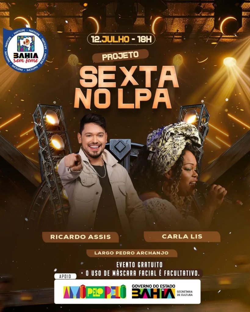 Sexta (12/07), às 18h, ocorre o Sexta no LPA, com shows de Ricardo Assis e Carla Lis. O evento acontecerá no Largo Pedro Archanjo, localizado na Rua Gregório de Matos, 10 – Pelourinho.