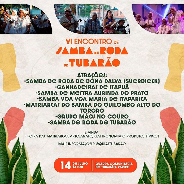 O Subúrbio Ferroviário de Salvador será palco do VI Encontro de Samba de Roda de Tubarão no dia 14 de julho. O evento, único em Salvador dedicado à cultura do Samba de Roda, reúne comunidade, artistas, grupos convidados e turistas para uma imersão na cultura afro-indígena da Bahia.