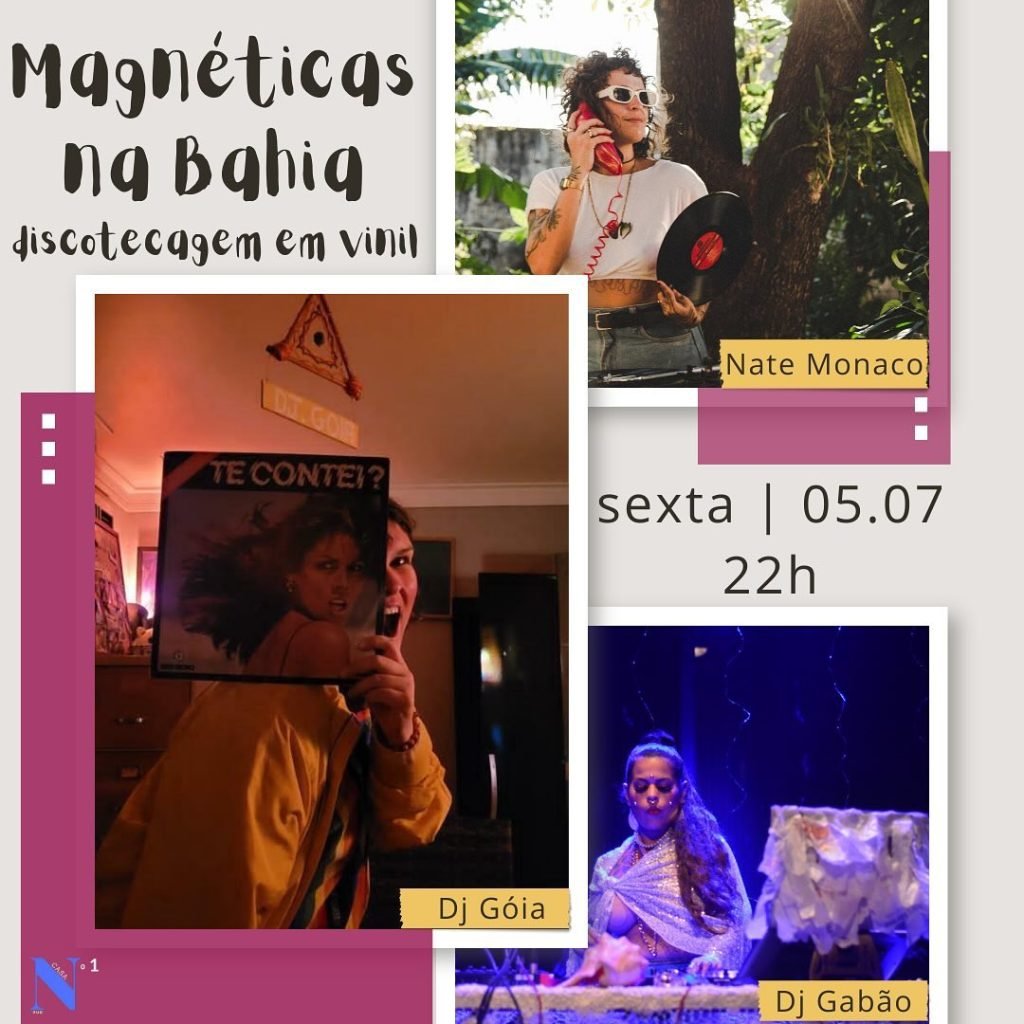 Sexta (05/07), às 22h, ocorre o Magnéticas na Bahia, evento de discotecagem em vinil com participação de Nate Monaco, DJ Góia e DJ Gabão. O evento acontecerá no Pub Casa N°1, localizado na Rua Aristides Áttico, 38 – Barbalho.
